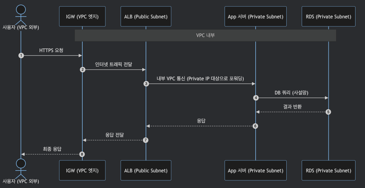 사용자 → IGW → ALB(퍼블릭) → 서버(프라이빗) → RDS(프라이빗) → 응답 반환(같은 경로 반대로)