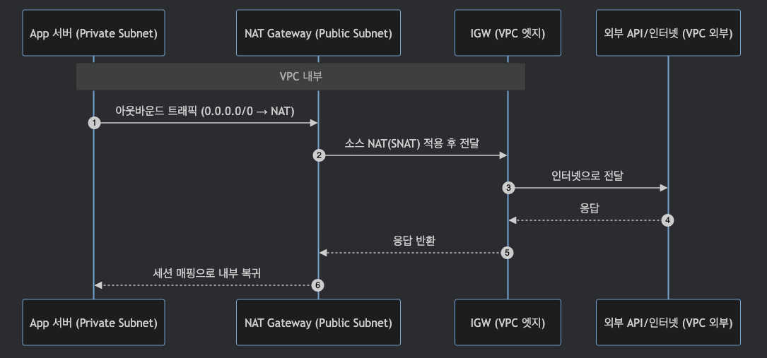 | 프라이빗 서브넷에서 외부 API 요청 | 0.0.0.0/0에서 NAT GW로 보냄 | 밖으로 나갈 건 주방 뒷문으로 |
