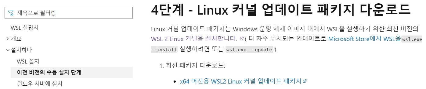 위 주소로 가면 아래에 4단계 항목에 있는 x64 머신용 WSL2 Linux 커널 업데이트 패키지를 클릭해