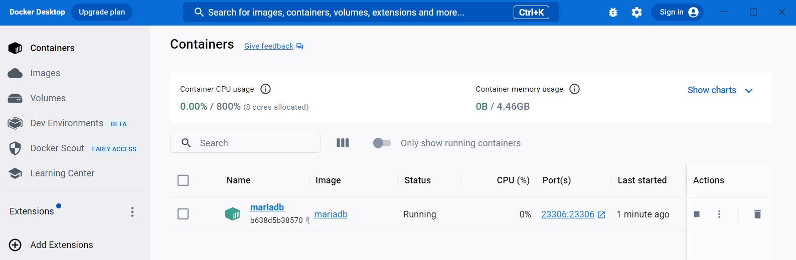 Docker Desktop Containers 메뉴에서 생성된 컨테이너를 확인할 수 있습니다.