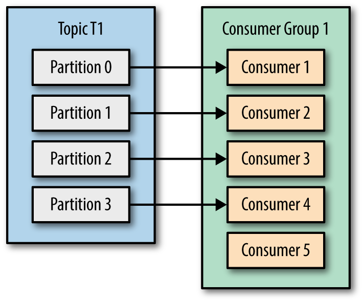 파티션 수 < 컨슈머 수: 잉여 컨슈머 발생(동작하지 않음).