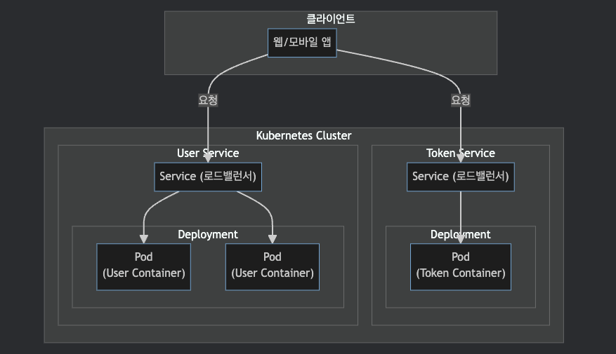 마이크로서비스 아키텍처에서 각 마이크로서비스는 독립적으로 배포 및 확장이 가능하다. 이때 쿠버네티스 환경에서 구현할 경우 일반적으로 하나의 마이크로서비스는 하나의 컨테이너, 파드로 구조를 따른다. 예를 들어 토큰 서비스, 사용자 서비스 2개의 서비스가 있다면 각 독립적인 컨테이너와 파드로 구성되며 총 2개의 컨테이너와 2개의 파드가 된다.